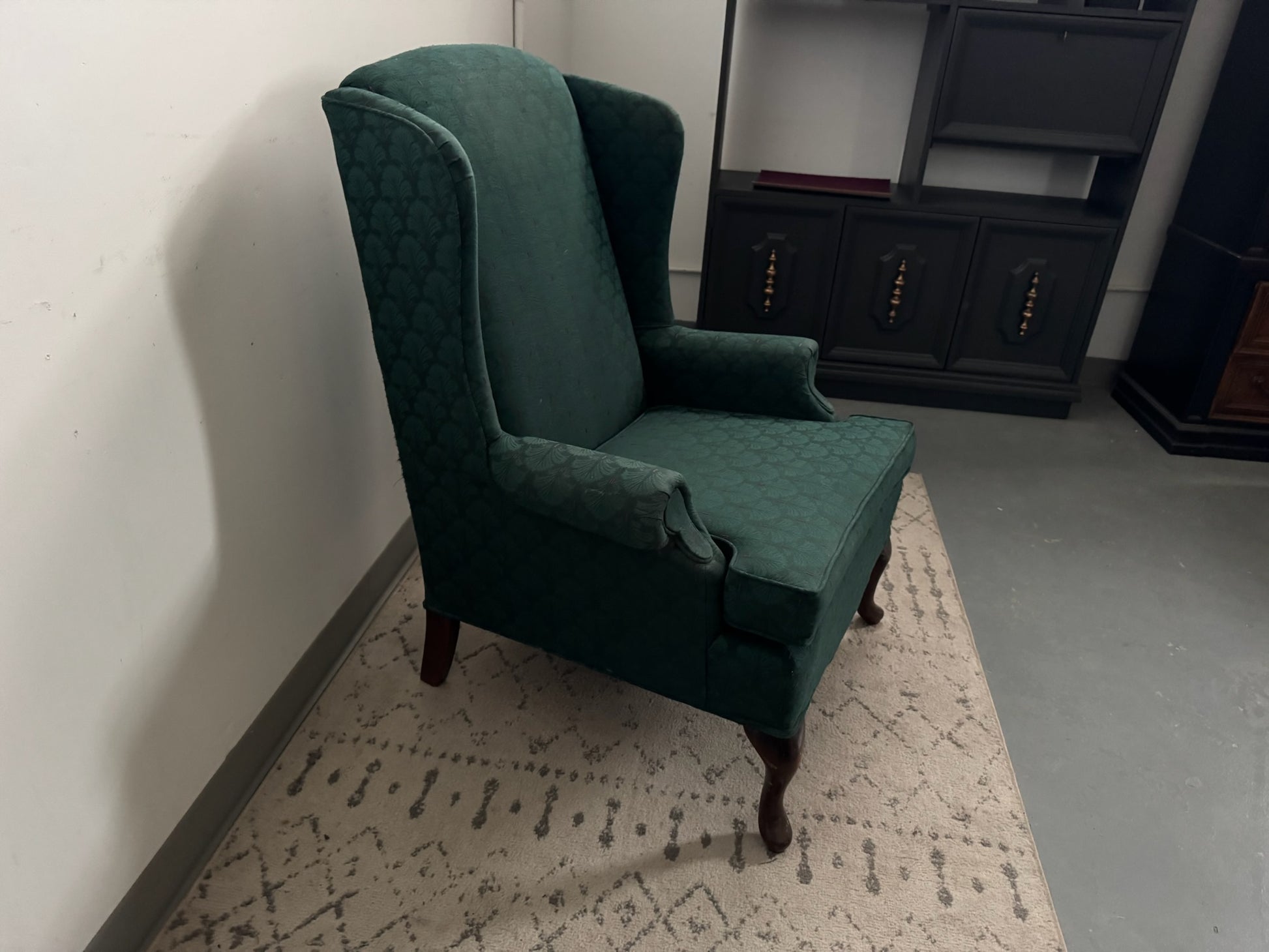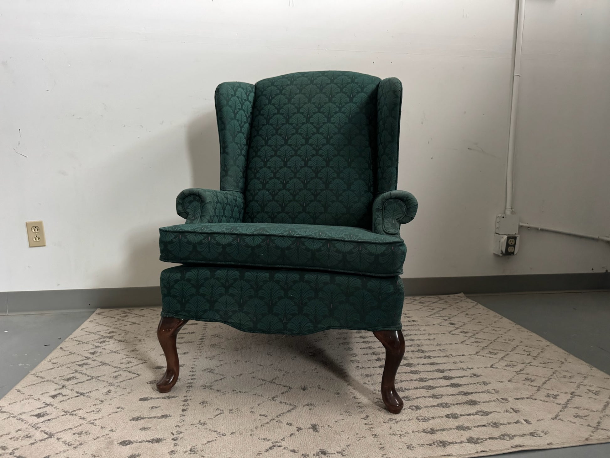 Classic wingback chair featuring a timeless silhouette with a high back, rolled arms, and a generously cushioned seat. Has a rich deep green patterned fabric that adds warmth and character while remaining versatile enough for a variety of interiors.