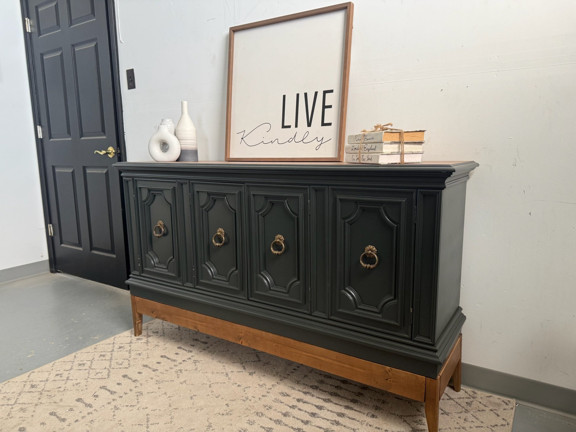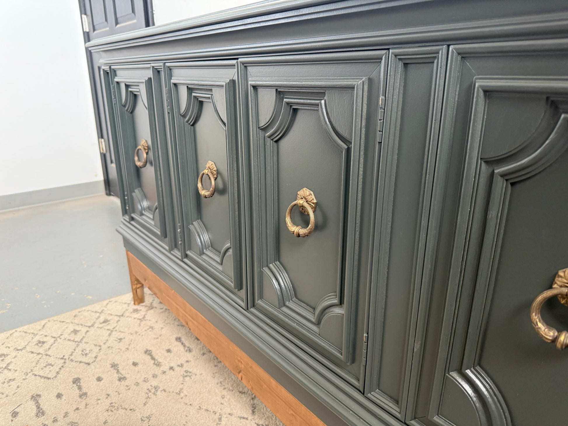 This elegant deep green buffet has been completely refinished and sealed with multiple coats of polyurethane for a smooth, durable finish. It features a custom handcrafted wood base that adds warmth and contrast to the rich green tone. Finished with gold hardware and detailed paneling, this piece brings a touch of sophistication to any space. Perfect for use as a buffet, credenza, or media console, it’s a timeless statement piece that combines classic charm with modern style.