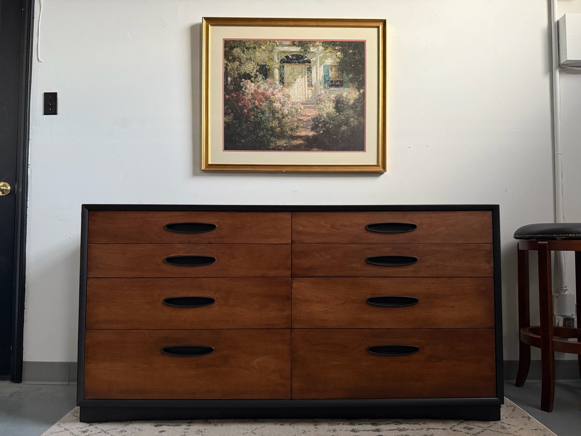 This stunning two tone Mid-Century Modern Henredon dresser has been beautifully refinished to highlight its bold, timeless lines. The drawer fronts are stained in a rich walnut tone, showcasing the natural wood grain, while the body and drawer pulls is painted in a sleek satin black for a striking contrast.