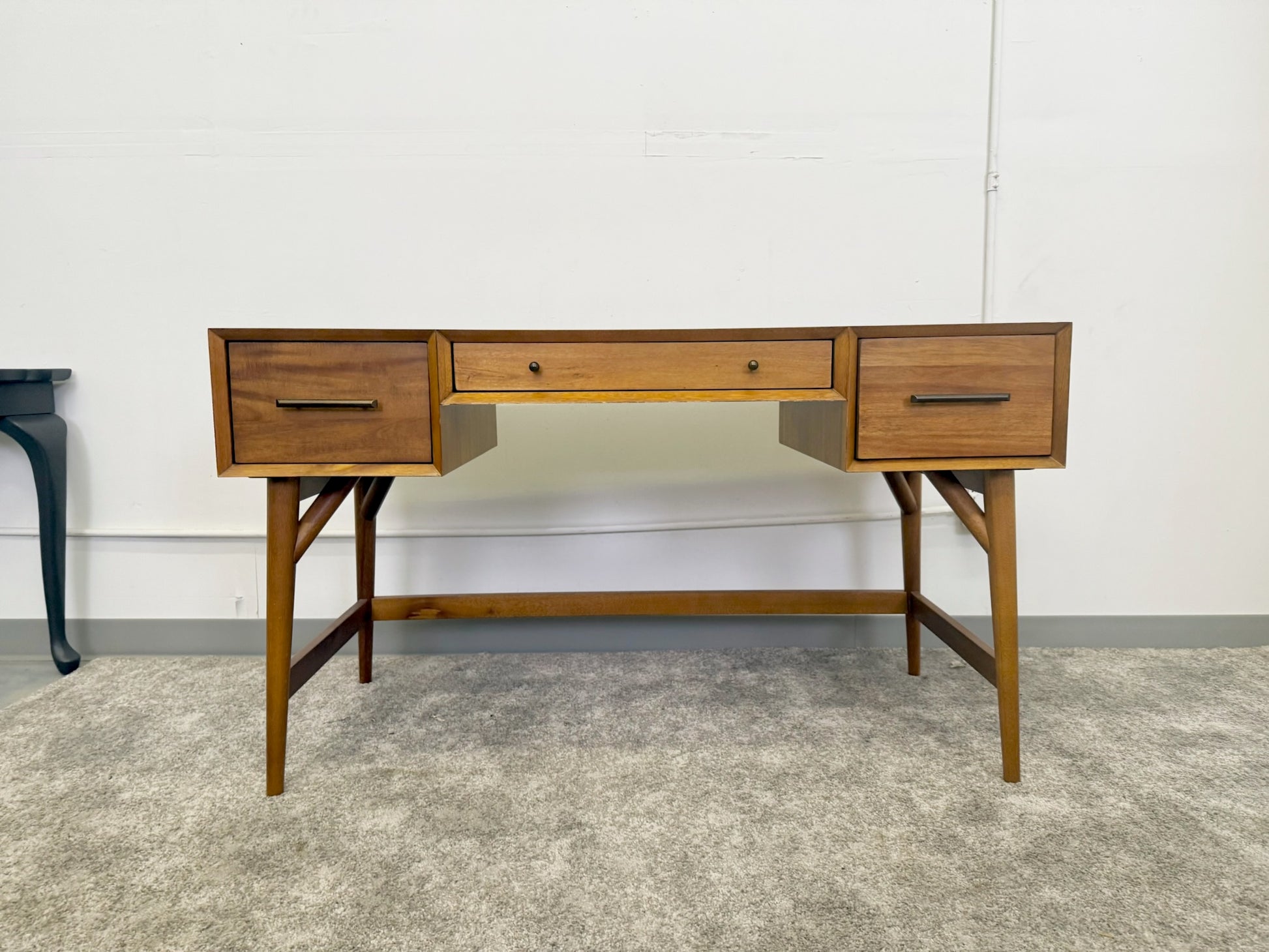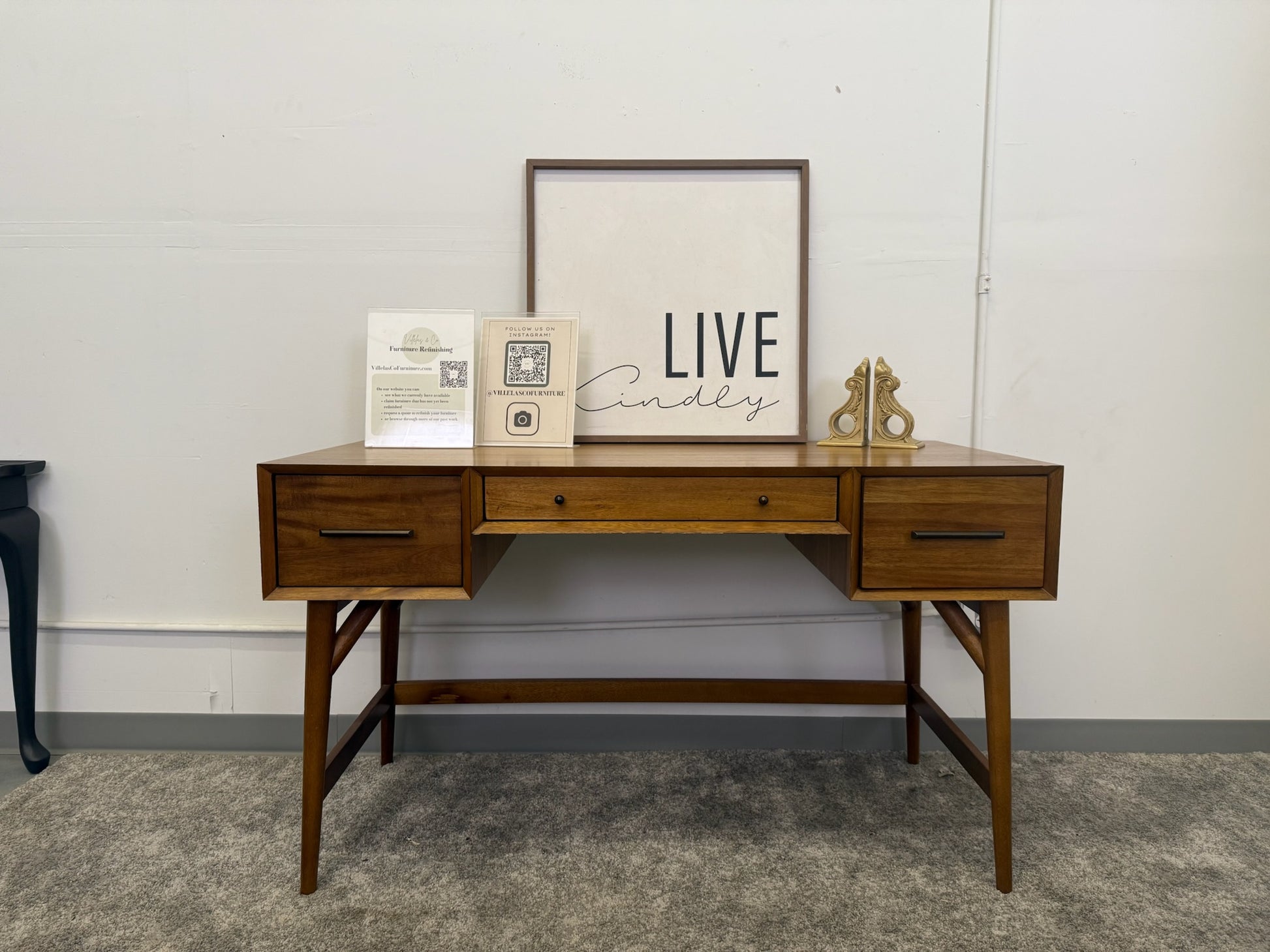 Bring charm into your office or study space with this stunning mid century modern wooden desk. An elegant design backed by great craftsmanship. Features Solid Wood Construction: Built to last with high-quality wood, ensuring durability and stability. Rich Warm Finish: The beautifully preserved wood grain enhances its timeless appeal.