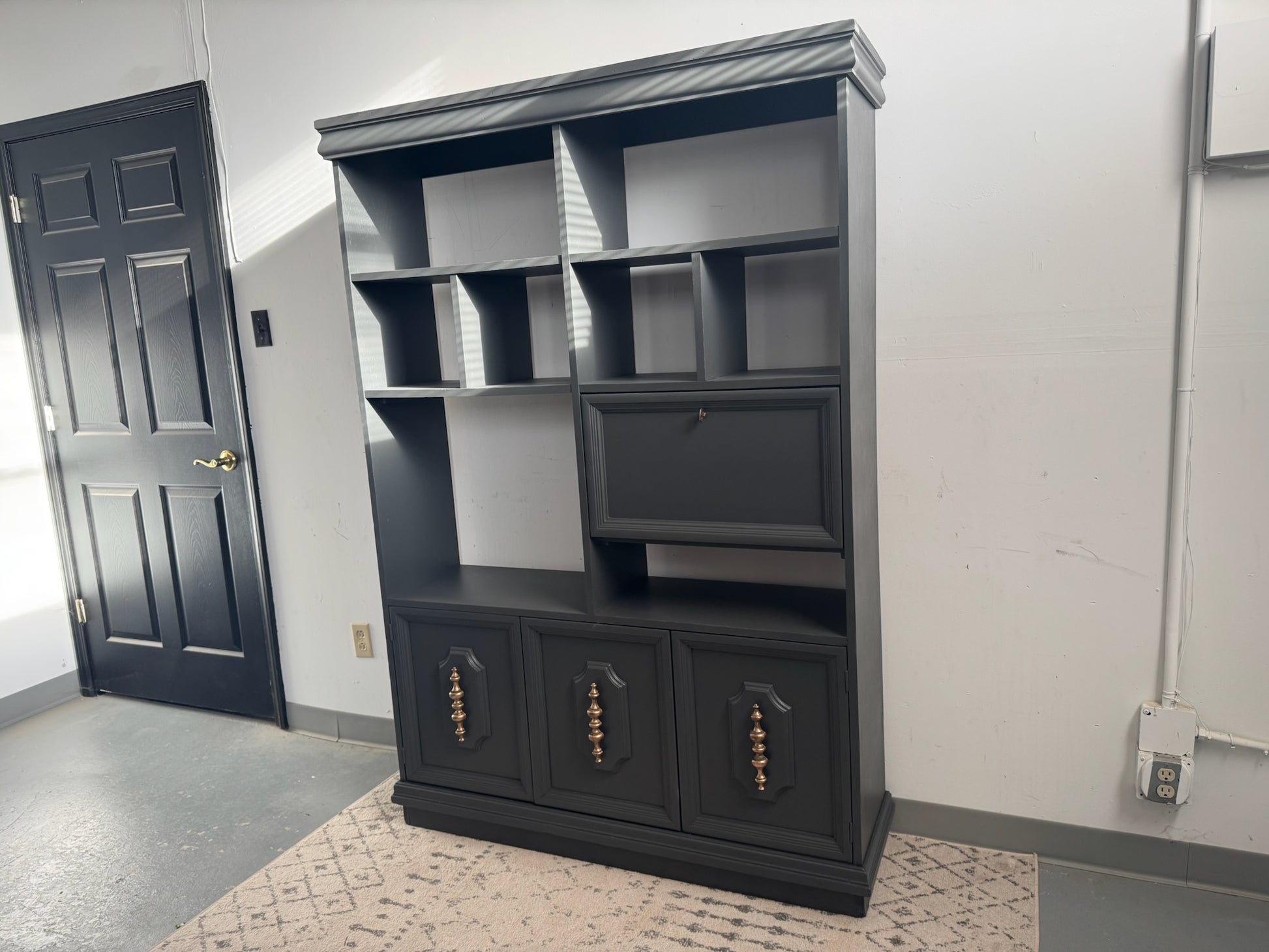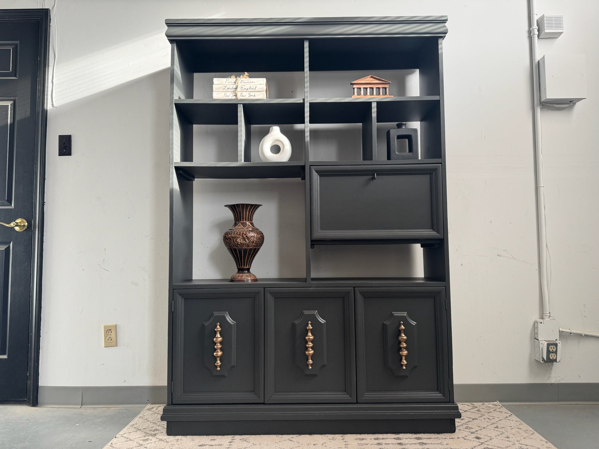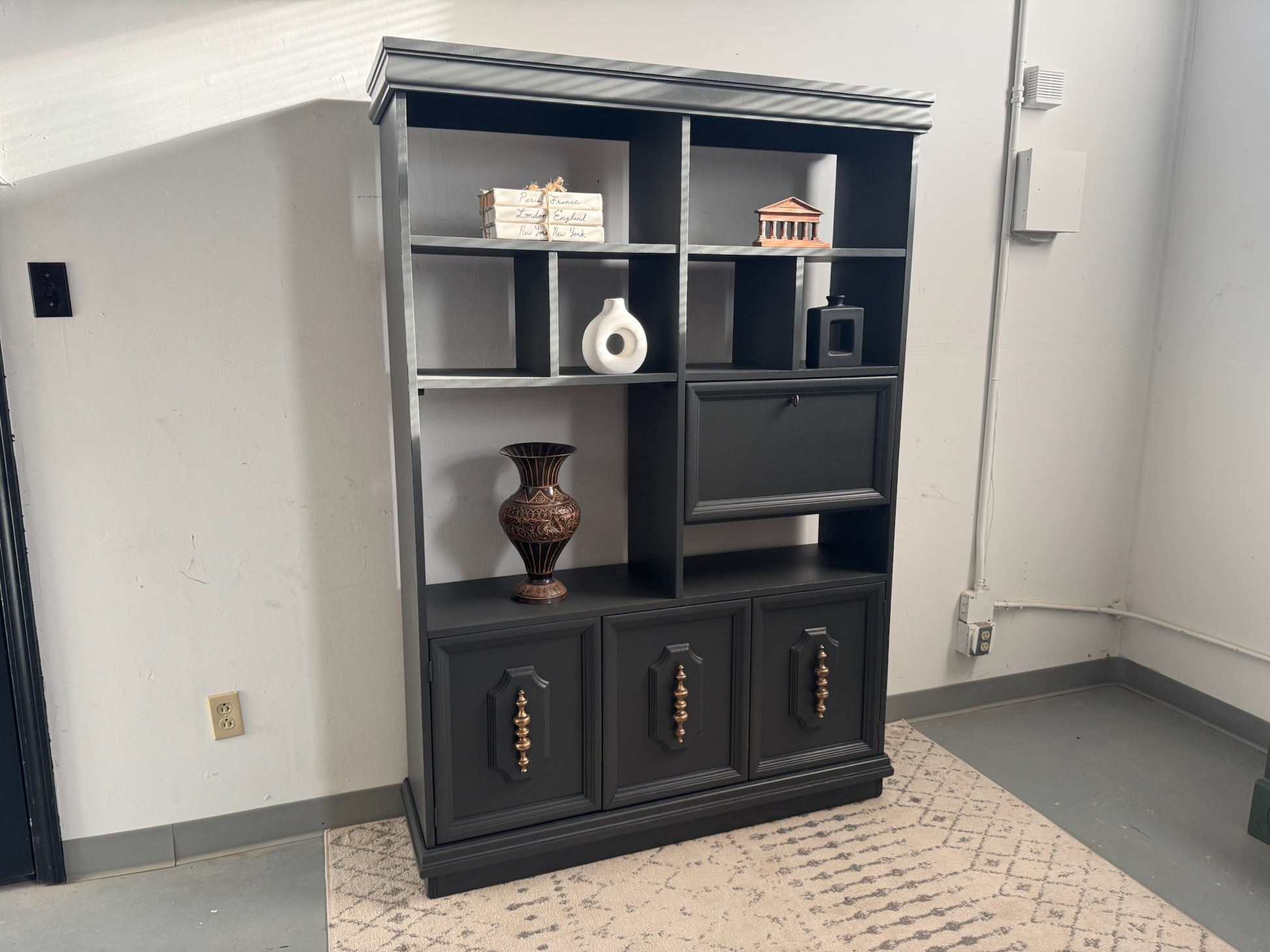 This beautiful solid-wood cabinet has been professionally refinished in a rich Iron Ore by Sherwin Williams for a sleek, modern look that fits perfectly in living rooms, offices, bedrooms, or entryways. The unique open-shelving layout makes it ideal for décor, books, plants, and storage, while the bottom cabinets offer ample concealed space. The drop-down compartment adds an elevated, custom touch and is perfect for storing barware, tech accessories, or small items.