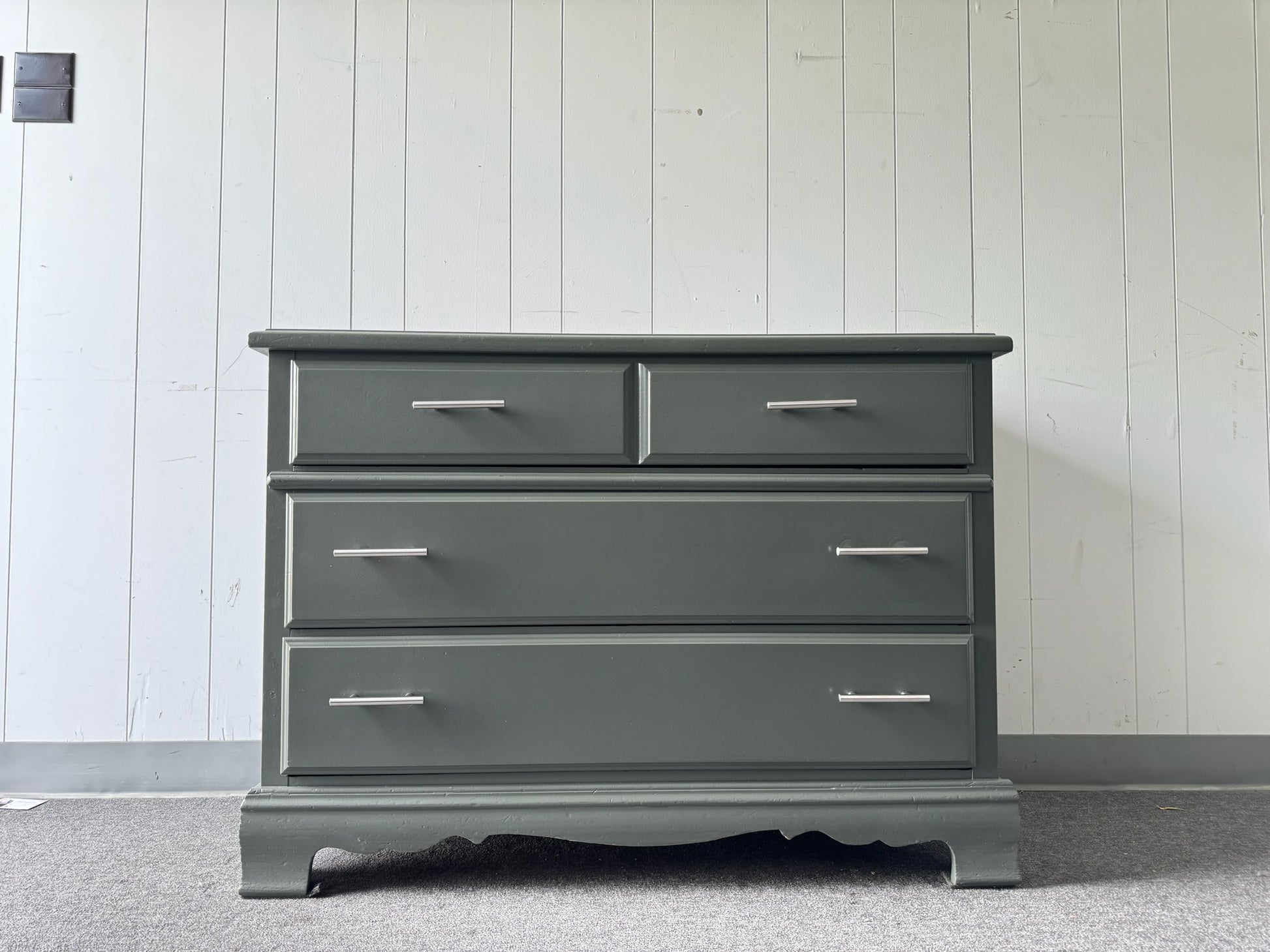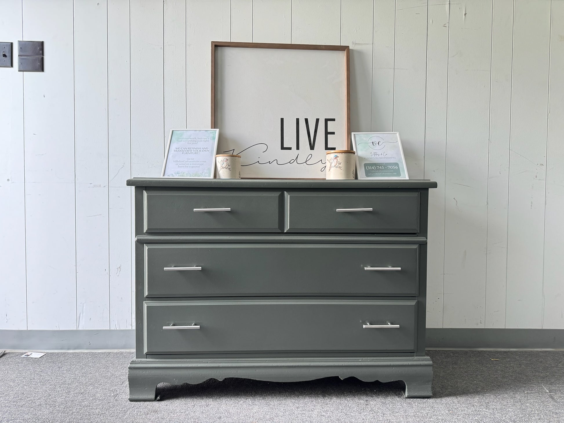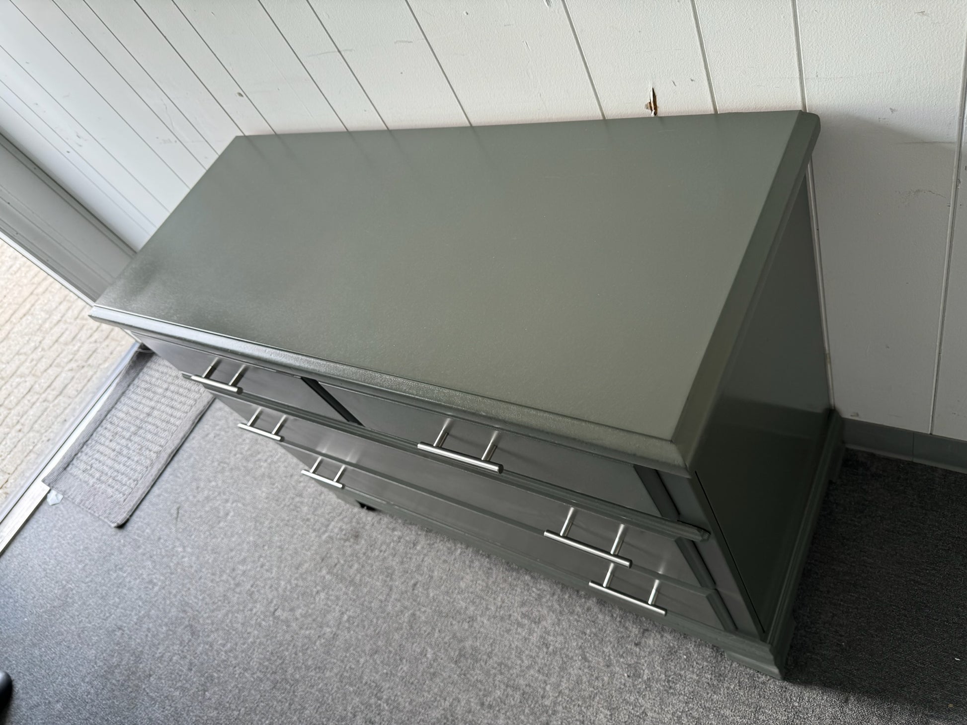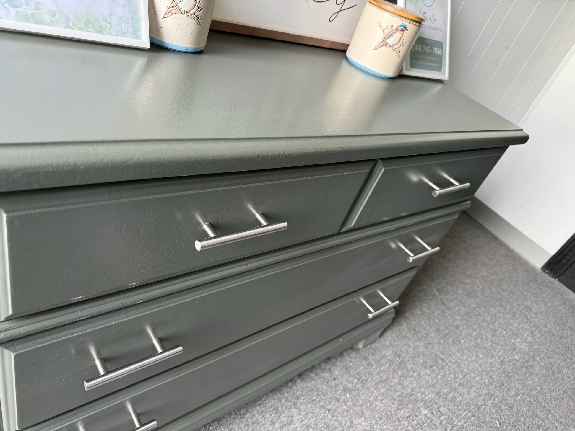 This beautiful sage green Dresser is crafted from solid wood, offering both style and durability. It features well-functioning drawers, ensuring easy access to your stored items. This piece combines practicality with timeless charm. Coated in multiple layers of polyurethane, it is designed to resist water and wear.
