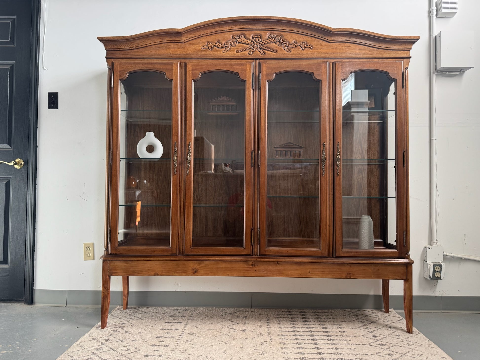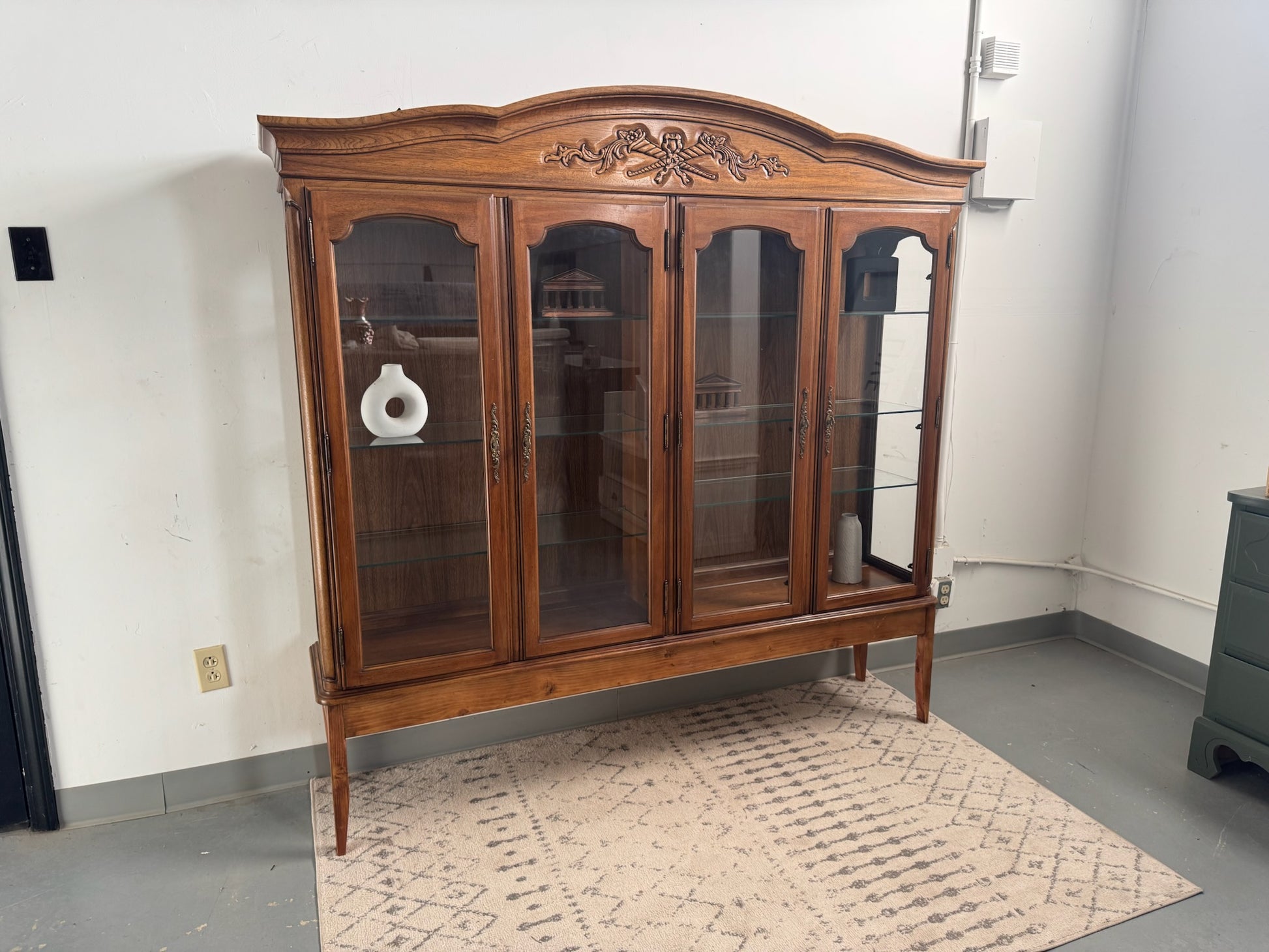 This beautiful Thomasville display hutch has been professionally restored and is in excellent condition. Known for their timeless craftsmanship, Thomasville pieces are built to last — and this one is no exception. Featuring four glass-front doors, glass side panels, carved wood detailing, adjustable glass shelves, and warm interior lighting, this hutch is perfect for showcasing décor, collectibles, or fine china.