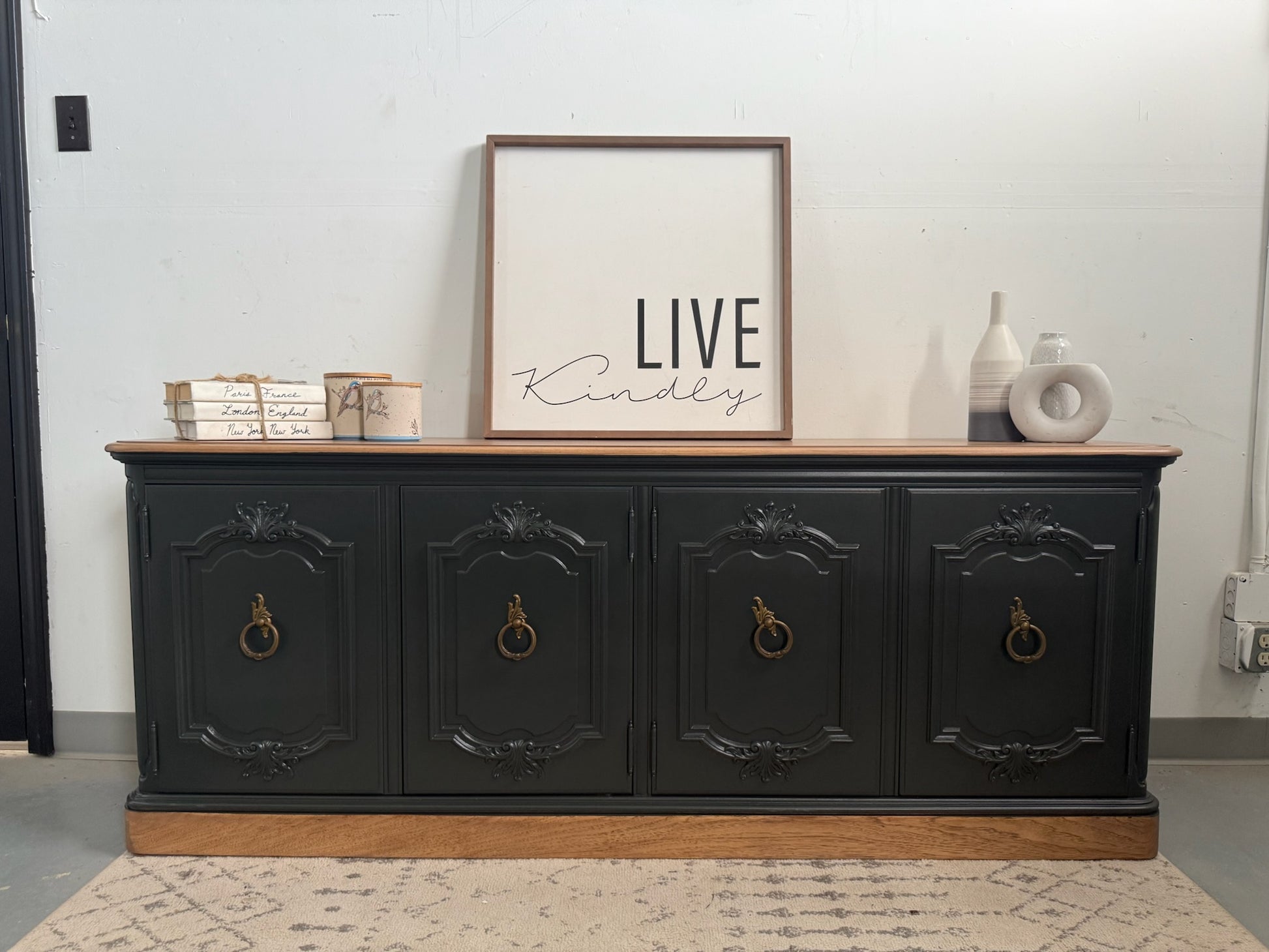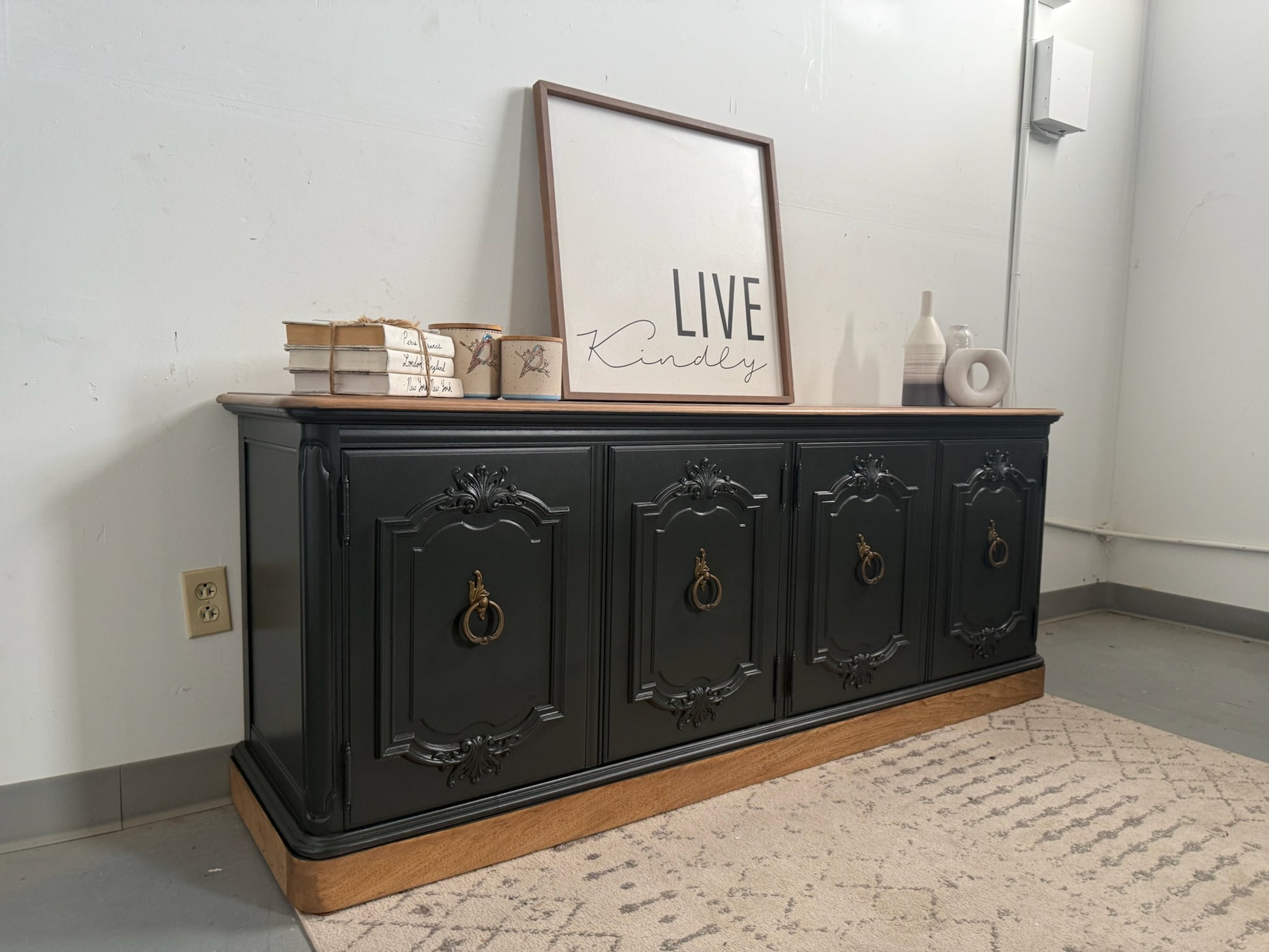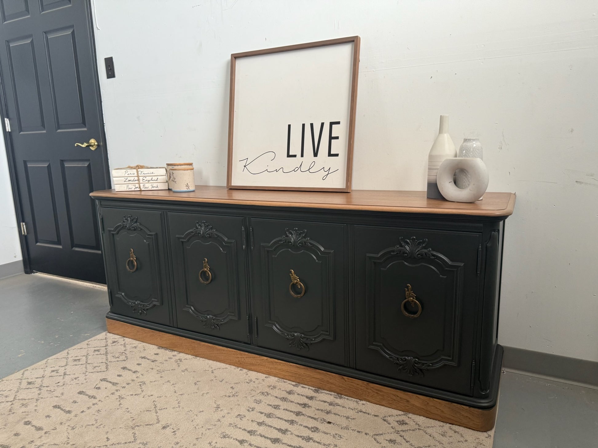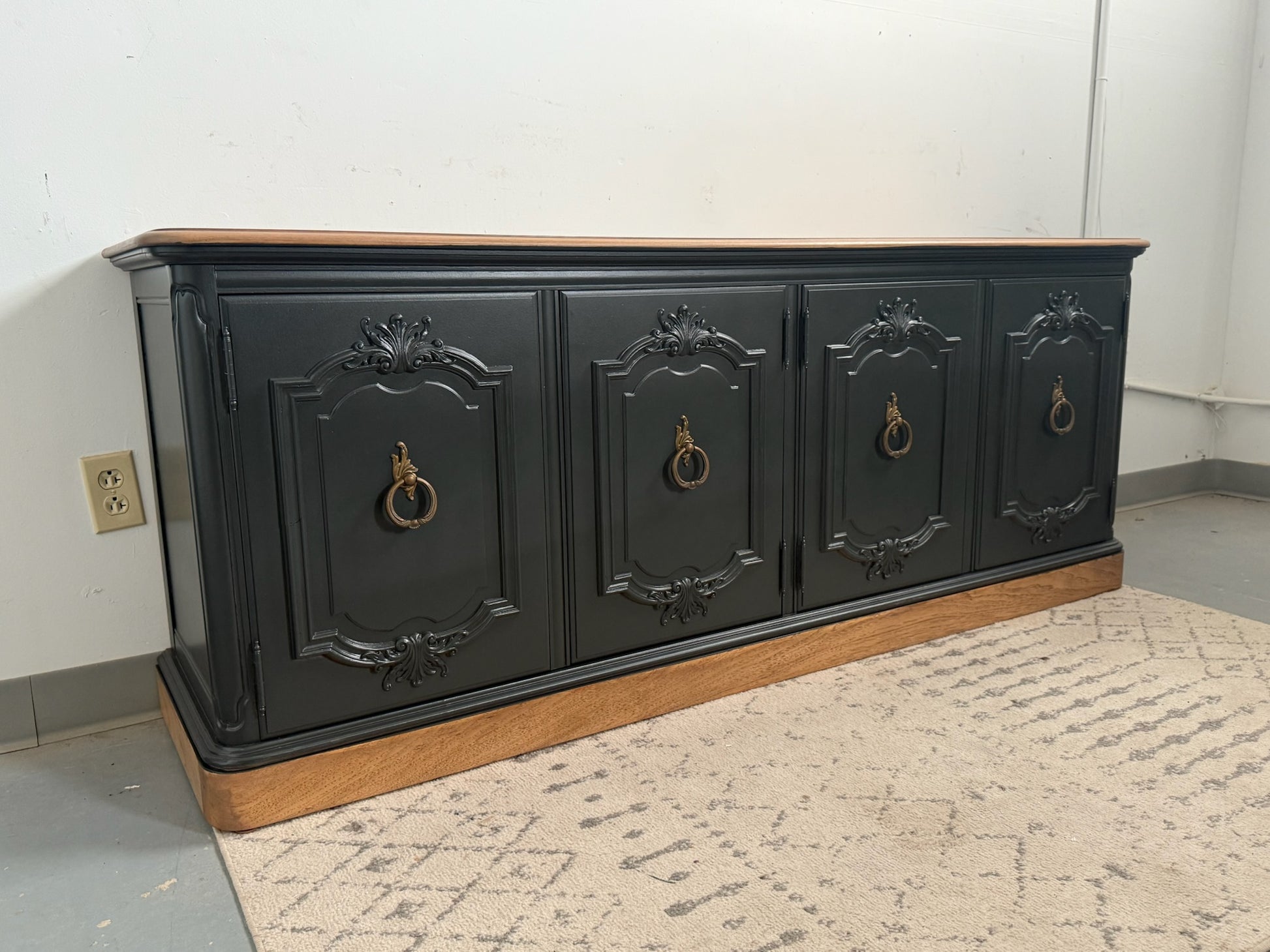This beautiful piece has been refinished in a deep, elegant black with a rich wood top and base for the perfect contrast. The ornate details on the doors are highlighted with classic antique brass ring pulls, adding timeless charm and character. To ensure durability and a lasting finish, it has been sealed with multiple coats of polyurethane, making it both stylish and practical for everyday use. Perfect as a buffet, credenza, or media console—this piece will instantly elevate any space.