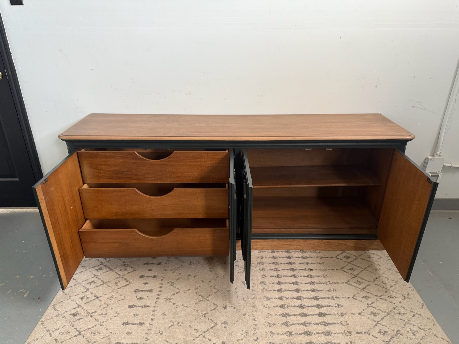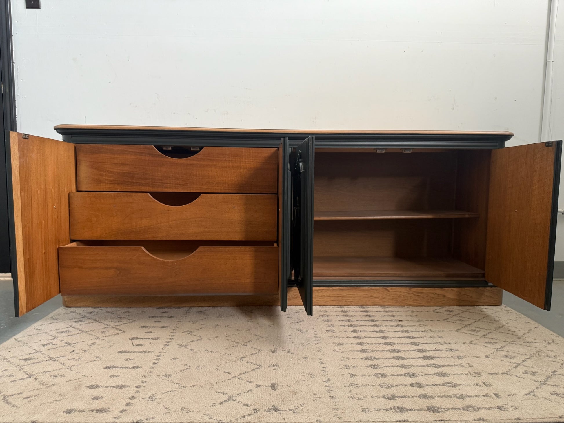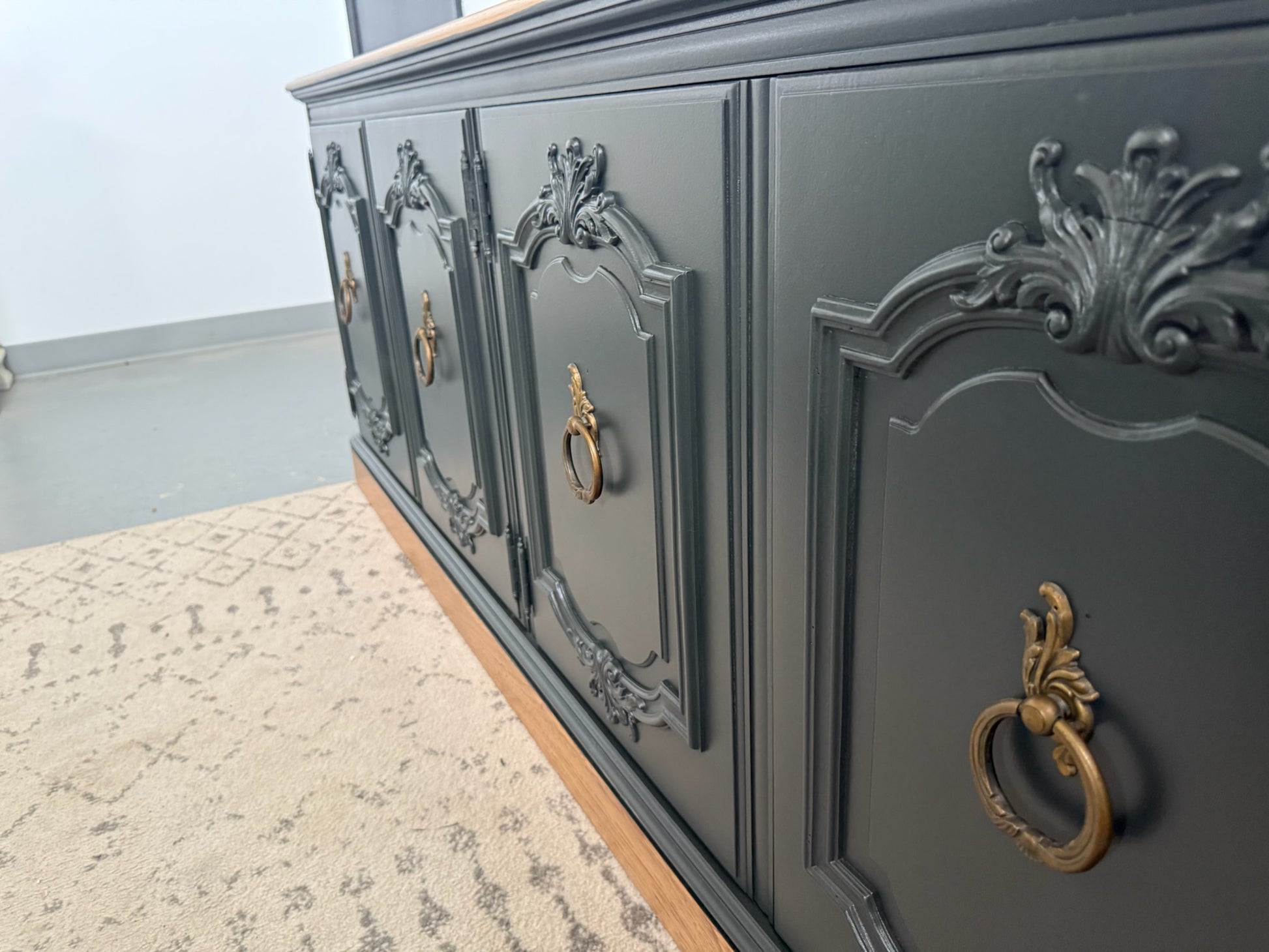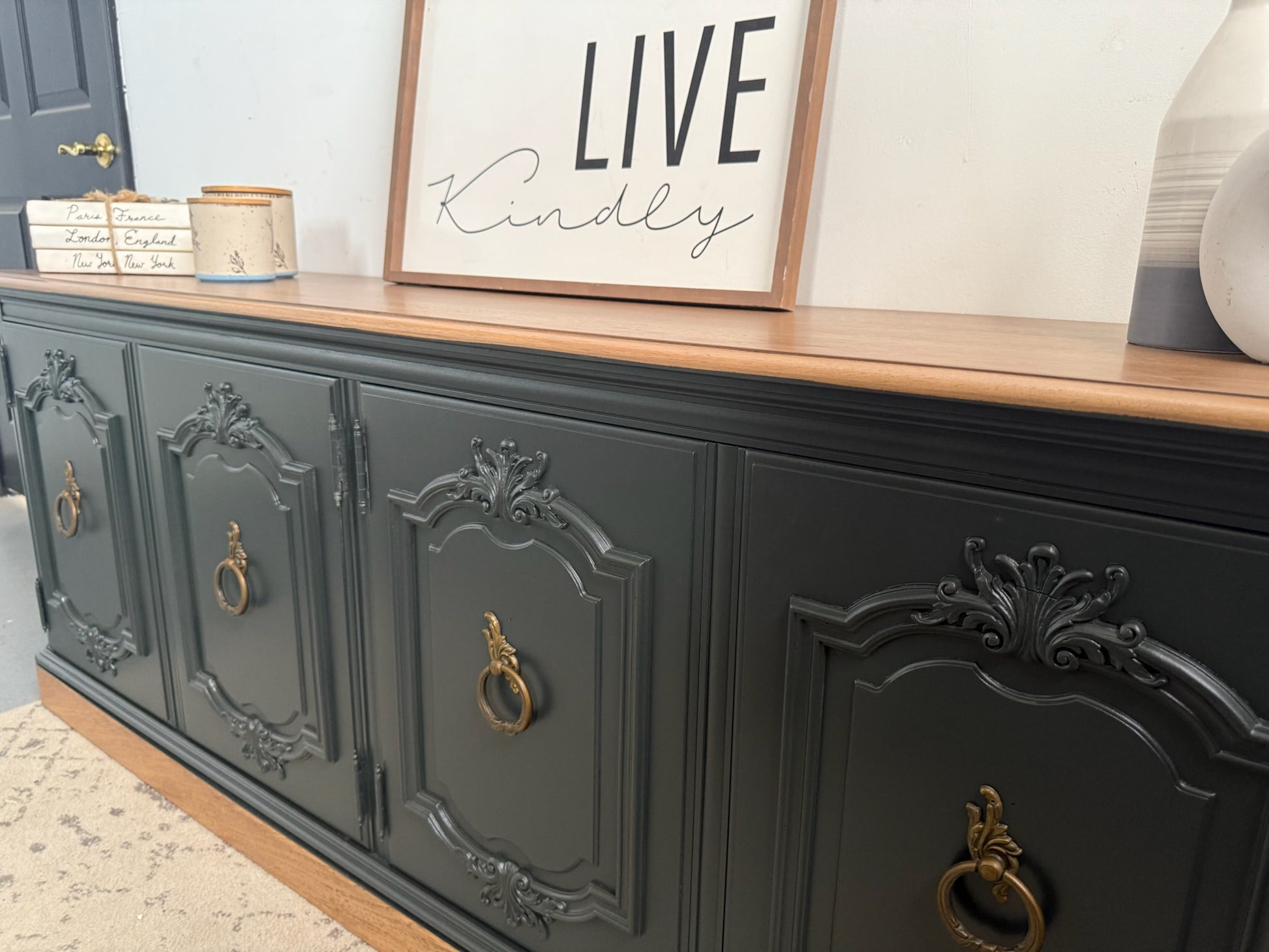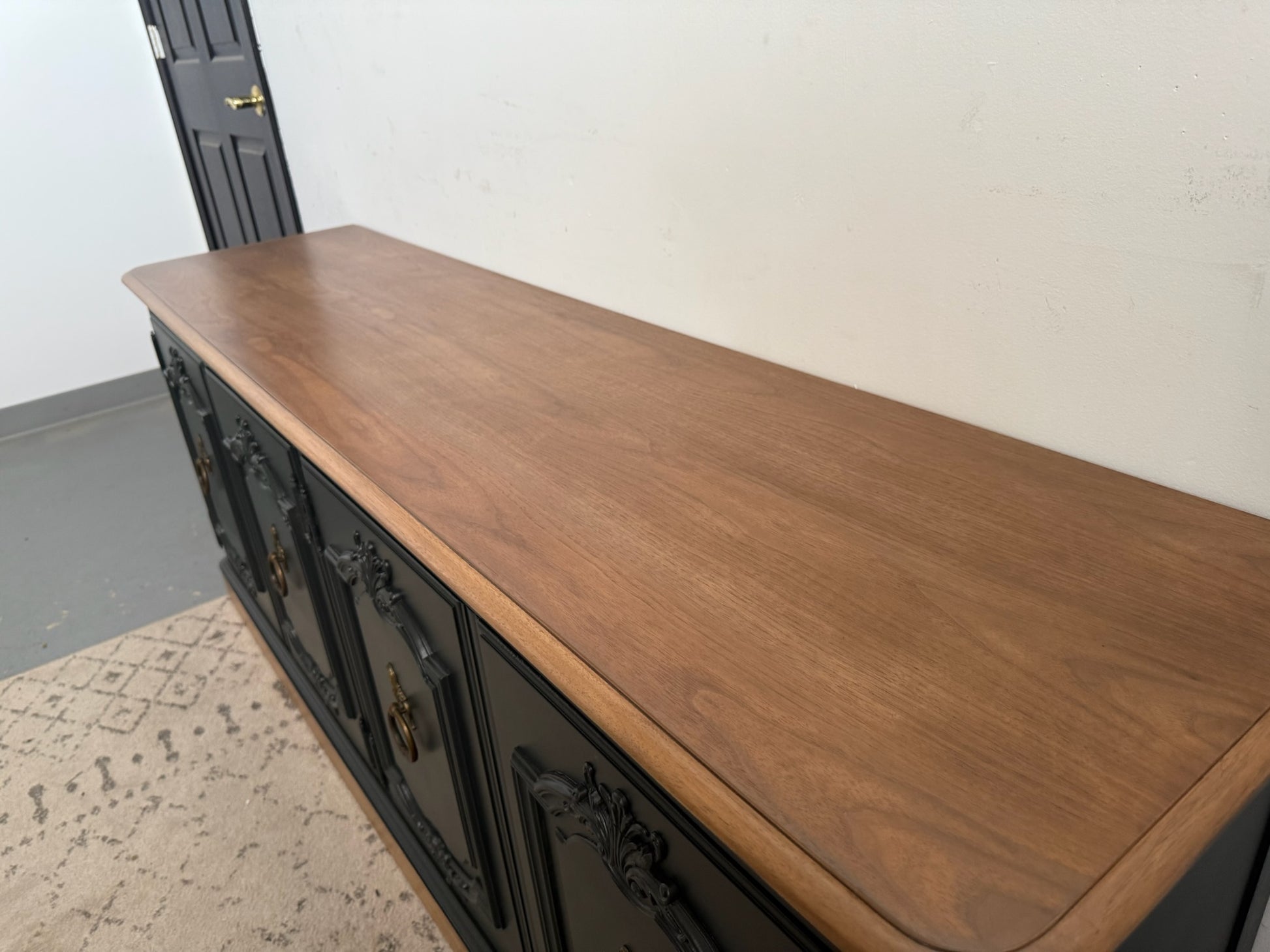 This beautiful piece has been refinished in a deep, elegant black with a rich wood top and base for the perfect contrast. The ornate details on the doors are highlighted with classic antique brass ring pulls, adding timeless charm and character. To ensure durability and a lasting finish, it has been sealed with multiple coats of polyurethane, making it both stylish and practical for everyday use. Perfect as a buffet, credenza, or media console—this piece will instantly elevate any space.